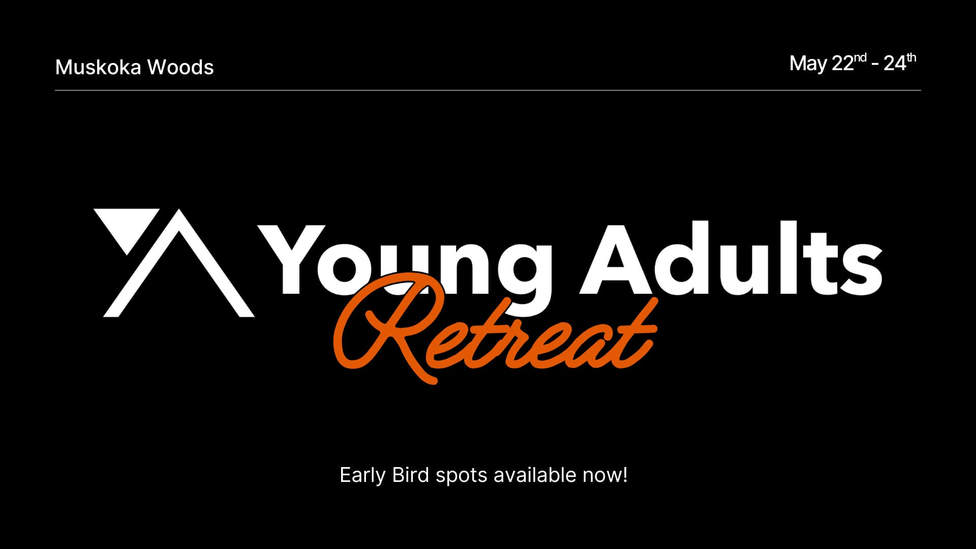 Join us for our Young Adults Retreat from Friday, May 22 to Sunday, May 24—a weekend designed to help you unplug, have fun, and build deeper relationships with other Young Adults at OneChurch.to.